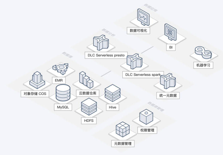 DLC帮助客户实现由数据库场景无缝升级到大数据场景,支持对多源异构数据进行联合查询分析,包括对象存储、云数据库、其他数据服务等。用户通过统一的数据视图,使用标准的SQL即可快速实现多源数据联邦分析,打通数据孤岛,发挥数据价值。